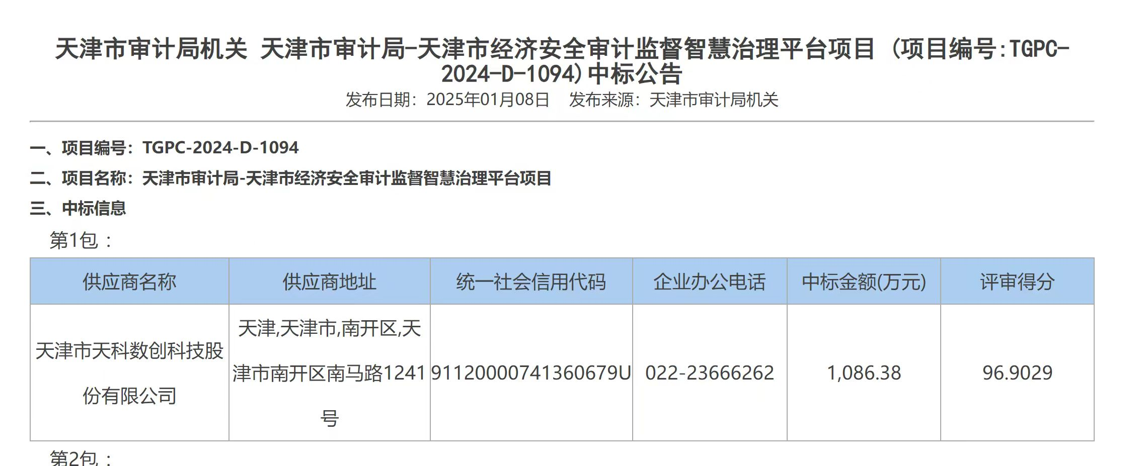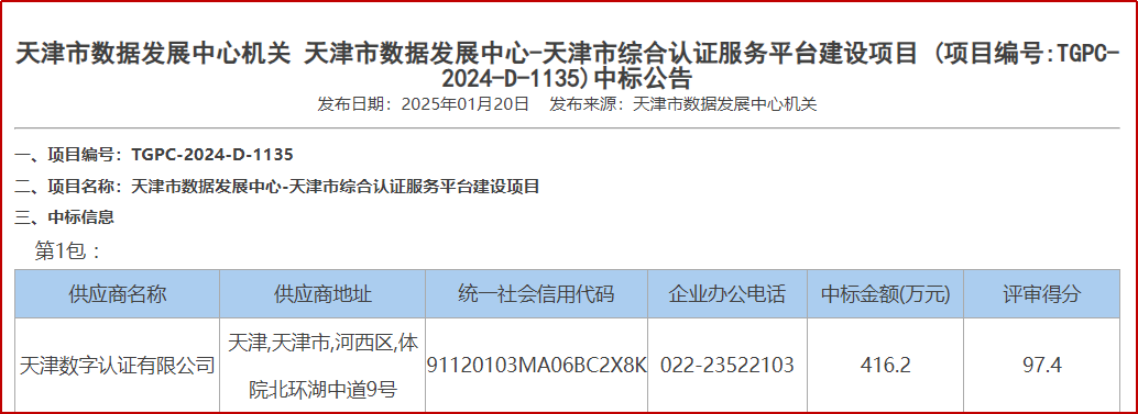 近日,黑料 所属天津数字经济产业集团有限公司(以下简称“天数集团”)旗下天津市天科数创科技股份有限公司(以下简称“天科数创”)与天津数字认证有限公司(以下简称“天津CA”)捷报频传,分别中标“天津市审计局智慧治理平台项目”及“天津市综合认证服务平台建设项目”,数智赋能天津市政府数字化转型发展。